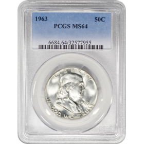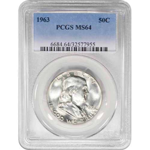 The Franklin Half-Dollar was designed by Chief Engraver, John R. Sinnock and was struck for 16 years (1948-1963). The obverse and reverse of the Franklin Half-Dollar features lustrous blast-white surfaces. Its composition is 90 percent silver and 10 percent copper. Featured on the obverse of the Franklin Half-Dollar is the portrait of Benjamin Franklin. Engraved directly above his portrait is the word, “Liberty.” Below Franklin’s portrait is the, “In God We Trust,” motto.