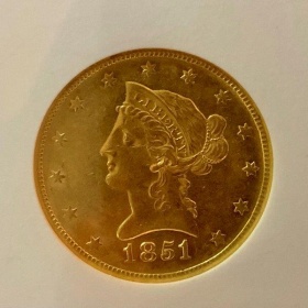 1851-O $10 Liberty S.S. Republic AU58 NGC 90% Gold, 10% Copper .48375 oz